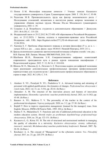 Обсуждение и заключения. Проанализировав работы отечественных исследователей, мы установили ключевые особенности системы ДПО и разработали модель её устойчивого функционирования и развития с характеристиками опережающего развития системы. Такая система способна, формируя основание для сфер общества, опережать изменения, происходящие в них. В качестве перспектив развития науки и практики была обозначена детальная разработка механизма соотношения функционирования и развития системы ДПО, было обозначено определение степени «коррелированности» социальных и экономических систем, которая побуждает постановку вопроса динамики развития системы ДПО в среднесрочной перспективе.