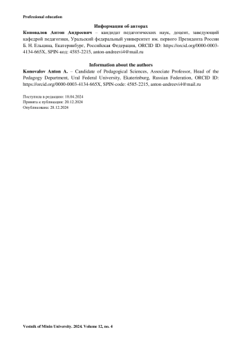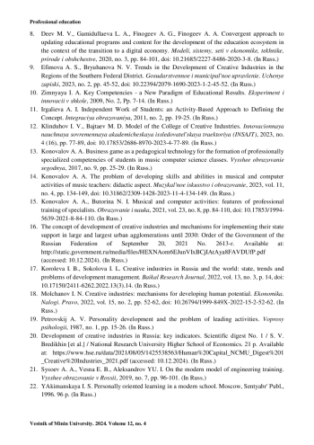 14. Коновалов А. А. Проблема формирования умений и навыков музыкально-компьютерной деятельности педагогов-музыкантов: дидактический аспект // Музыкальное искусство и образование. 2023. Т. 11, № 4. С. 134-149. https://doi.org/10.31862/2309-1428-2023-11-4-134-149.