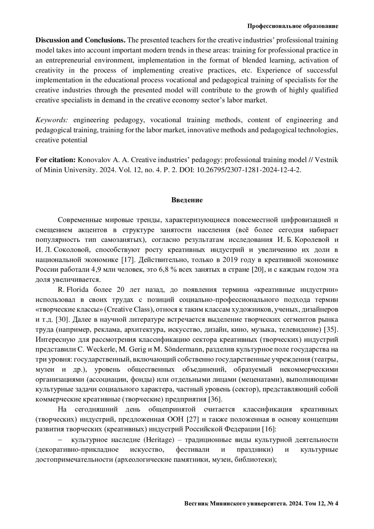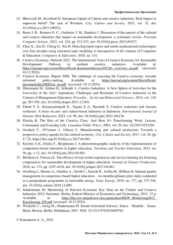 12. Клиндухов И. В., Байтаев М. Д. Модель колледжа креативных индустрий // Инновационная научная современная академическая исследовательская траектория (ИНСАЙТ). 2023. № 4 (16). С. 77-89. https://doi.org/10.17853/2686-8970-2023-4-77-89.