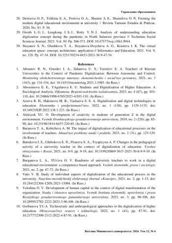2. Абросимова Е. Е., Ягафарова Э. У. Студенты и цифровизация высшего образования: социологический анализ // Ойкумена. Регионоведческие исследования. 2023. № 4 (67). С. 103-110. https://doi.org/10.24866/1998-6785/2023-4/103-110.