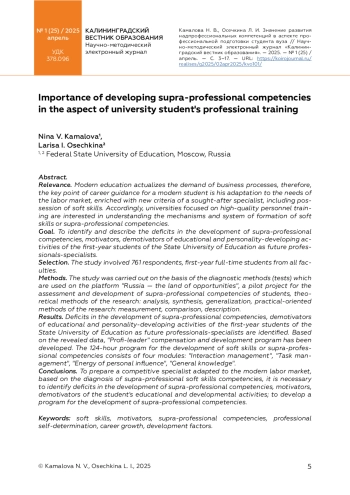 Выводы. Для подготовки конкурентоспособного, адаптированного к современному рынку труда специалиста на основе диагностики надпрофессиональных компетенций soft skills необходимо выявить дефициты в развитии надпрофессиональных компетенций, мотиваторы, демотиваторы образовательной и развивающей деятельности студента; разработать программу развития надпрофессиональных компетенций.