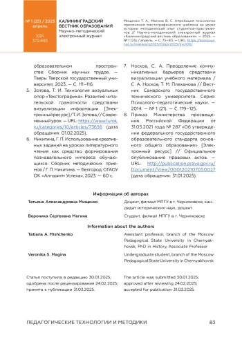 Авторы статьи исследуют методические основы реализации технологии преобразования разнообразной информации, предлагаемой обучающимся на уроке истории в 7–9 классах, в визуальные опоры. Способность анализировать и систематизировать информацию, предъявить ее в преобразованном виде, удобном для запоминания, является одним из требований ФГОС по истории, что отмечают и исследуют авторы, опираясь на практический опыт студентов в ходе производственной практики. Банк данных текстографических шаблонов предложила студентам филиала МПГУ школа учителя «Цифровой Форсайт», которая стала площадкой обсуждения реализации технологии различными педагогами, включая студентов филиала МПГУ в г. Черняховске. К преимуществам технологии следует отнести эффективность в отработке умений анализировать, классифицировать, выделять главное, обнаруживать причинно-следственные связи, формулировать выводы. Визуальные опоры помогают в работе с историческими понятиями, хронологией, пространственными представлениями и вопросами культуры на уроке истории. К проблемам освоения технологии студентами можно отнести неумение предложить школьникам четкий алгоритм действий с шаблоном и отслеживать его в ходе урока, отсутствие преемственности работы с шаблоном на последующих уроках, затруднения при подборе критериев оценивания такой работы.