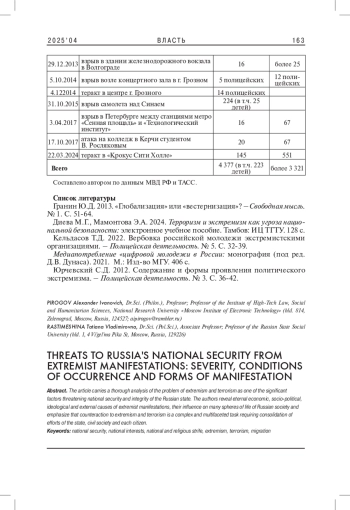 ПИРОГОВ А. И., РАСТИМЕШИНА Т. В. УГРО́ЗЫ НАЦИОНАЛЬНОЙ БЕЗОПАСНОСТИ РОССИИ ОТ ЭКСТРЕМИ́СТСКИХ ПРОЯВЛЕ́НИЙ: СУШНОСТЬ, УСЛОВИЯ ВОЗНИКНОВЕНИЯ И ФОРМЫ ПРОЯВЛЕНИЯ // ВЛАСТЬ. 2025. ТОМ 33 № 4