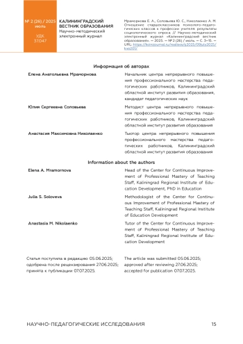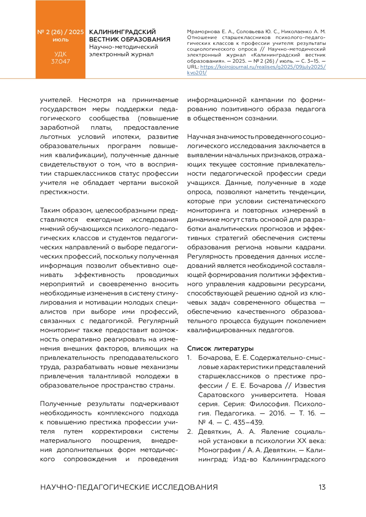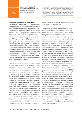 МРАМОРНОВА Е. А., СОЛОВЬЕВА Ю. С., НИКОЛАЕНКО А. М. ОТНОШЕНИЕ СТАРШЕКЛАССНИКОВ ПСИХОЛОГО-ПЕДАГОГИЧЕСКИХ КЛАССОВ К ПРОФЕССИИ УЧИТЕЛЯ // КАЛИНИНГРАДСКИЙ ВЕСТНИК ОБРАЗОВАНИЯ. 2025. № 2 (26)