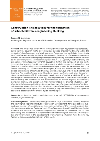 В статье рассмотрено, как наборы-конструкторы могут помочь школьникам 7-х — 11-х классов развить инженерное мышление в контексте цифровой экономики и дефицита кадров. Цель работы — теоретически обосновать и экспериментально проверить эффективность применения специализированных наборов-конструкторов как инструмента формирования инженерного мышления у школьников 7-х — 11-х классов. Исследование базируется на деятельностном подходе Л. С. Выготского и принципах междисциплинарного STEAM-образования. В рамках исследования были разработаны три авторских набора-конструктора (планер, беспилотный летательный аппарат типа «летающее крыло» с радиоуправлением и квадрокоптер на платформе Arduino); проведен эксперимент с участием 300 школьников из Калининграда, Казани, Новосибирска. Исследование включало диагностику технического мышления, опросы участников и педагогов. Результаты эксперимента показали значительное повышение мотивации школьников к инженерным профессиям (82 %), существенное развитие технических навыков (рост среднего балла технического мышления на 37 %) и навыков командной работы (улучшение на 45 %). Работа с конструкторами позволяет эффективно интегрировать знания из физики, математики, информатики и дизайна. Предложена модель внедрения, авторских образовательных наборов-конструкторов, учитывающая возрастные особенности и преемственность обучения. Подчеркивается, что практическое проектирование готовит к требованиям цифровой экономики, однако требует методической поддержки педагогов, особенно в области цифровых технологий.