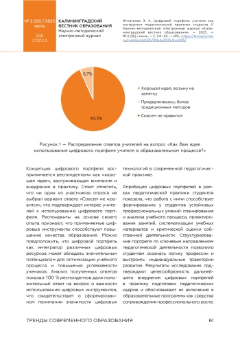 Статья посвящена анализу опыта применения цифрового портфеля учителя в педагогической практике студентов. Представлен теоретический обзор понятия «цифровой портфель». Раскрыты функции цифрового портфеля и его педагогический потенциал в условиях цифровизации образования. Акцент сделан на значении цифрового портфеля в формировании профессиональных, рефлексивных и коммуникативных компетенций будущих педагогов. Особое внимание уделено анализу опыта разработки и апробации цифрового портфеля студентами педагогического вуза в рамках практики. Освещены этапы проектирования индивидуального цифрового портфеля: структурирование разделов, подбор материалов, оформление, интеграция мультимедийного контента, фиксация результатов педагогической деятельности и рефлексии. Отмечены преимущества цифрового портфеля, обозначены трудности, возникающие при его внедрении. Подчеркивается значение цифрового портфеля как инструмента сопровождения профессионального роста студента в период практики. В рамках данного исследования был использован метод опроса для сбора данных о восприятии, опыте и оценке использования цифровых портфелей учителями в школе. По итогам апробации сделан вывод об эффективности цифрового портфеля как средства сопровождения профессионального роста студента, повышения осознанности и вовлеченности в практическую деятельность. Статья может быть полезна преподавателям педагогических вузов, методистам и студентам, осваивающим практико-ориентированные формы подготовки.