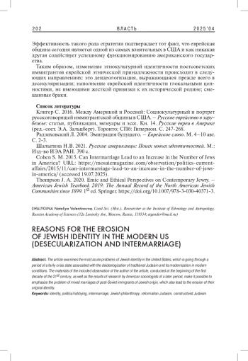 ШАЛЫГИНА Н. В. ПРИЧИНЫ РАЗМЫВАНИЯ ЕВРЕЙСКОЙ ИДЕНТИЧНОСТИ В СОВРЕМЕННЫХ США (ДЕСЕКУЛЯРИЗАЦИЯ И СМЕШАННЫЕ БРАКИ) // ВЛАСТЬ. 2025. ТОМ 33 № 4