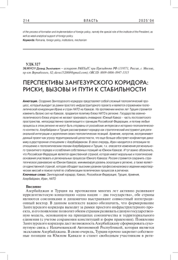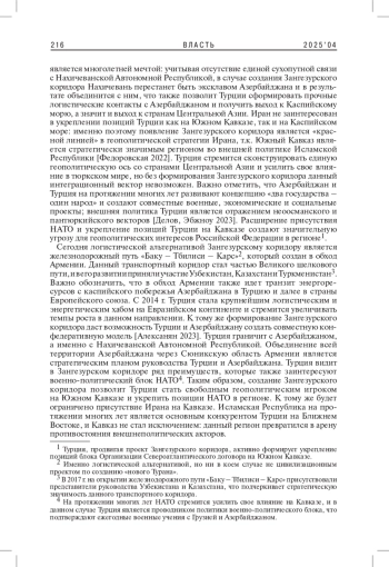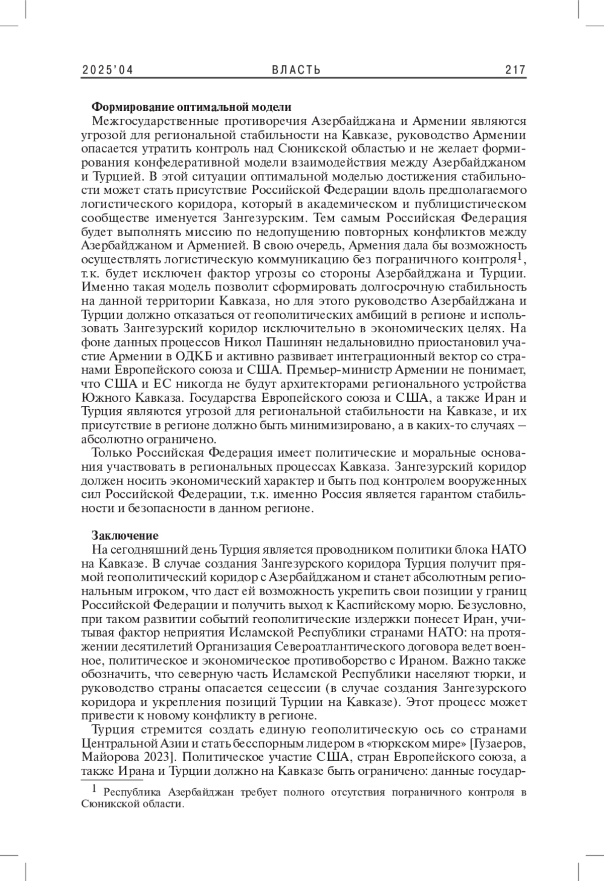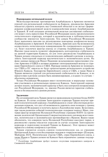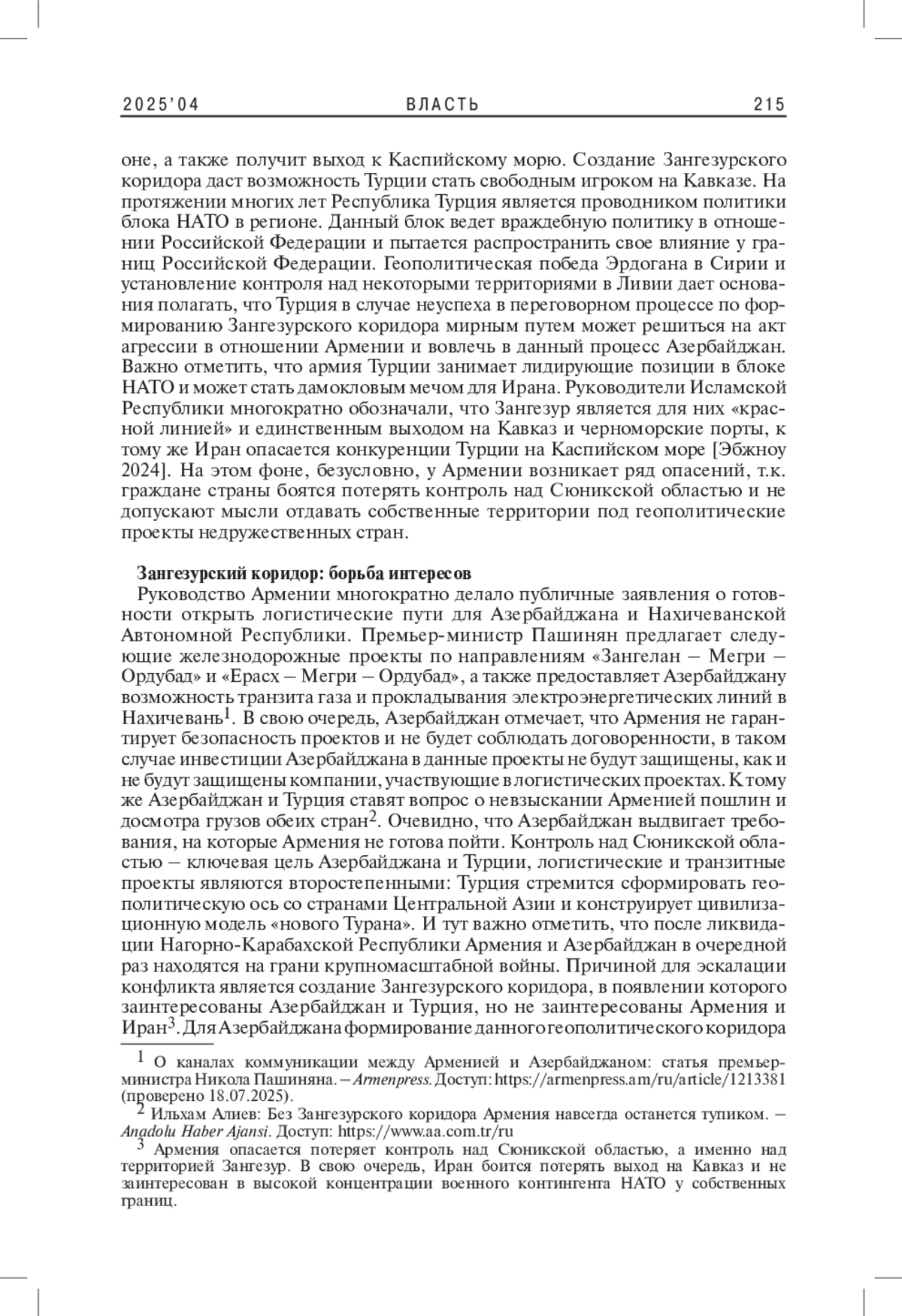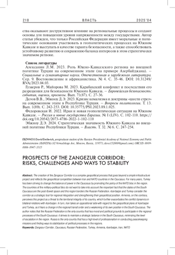 ЭБЖНОУ Д. Э. ПЕРСПЕКТИВЫ ЗАНГЕЗУРСКОГО КОРИДОРА: РИСКИ, ВЫЗОВЫ И ПУТИ К СТАБИЛЬНОСТИ // ВЛАСТЬ. 2025. ТОМ 33 № 4