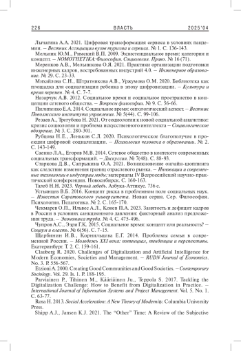 10. Добрина О.А. 2023. “Ускользающий мир” и “текучая современность”: образ социальности в британской постнеклассической социологии. - Теория и практика общественного развития. № 11. С. 88-92. EDN: FLYLMY