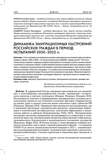 2. Гаджимурадова Г.И., Рабат Л. 2022. Эмиграция граждан России в 2015-2020 гг.: мониторинг современных тенденций и перспектив. - Научный результат. Социология и управление. Т. 8, № 1.С. 33-42. EDN: UWDAON