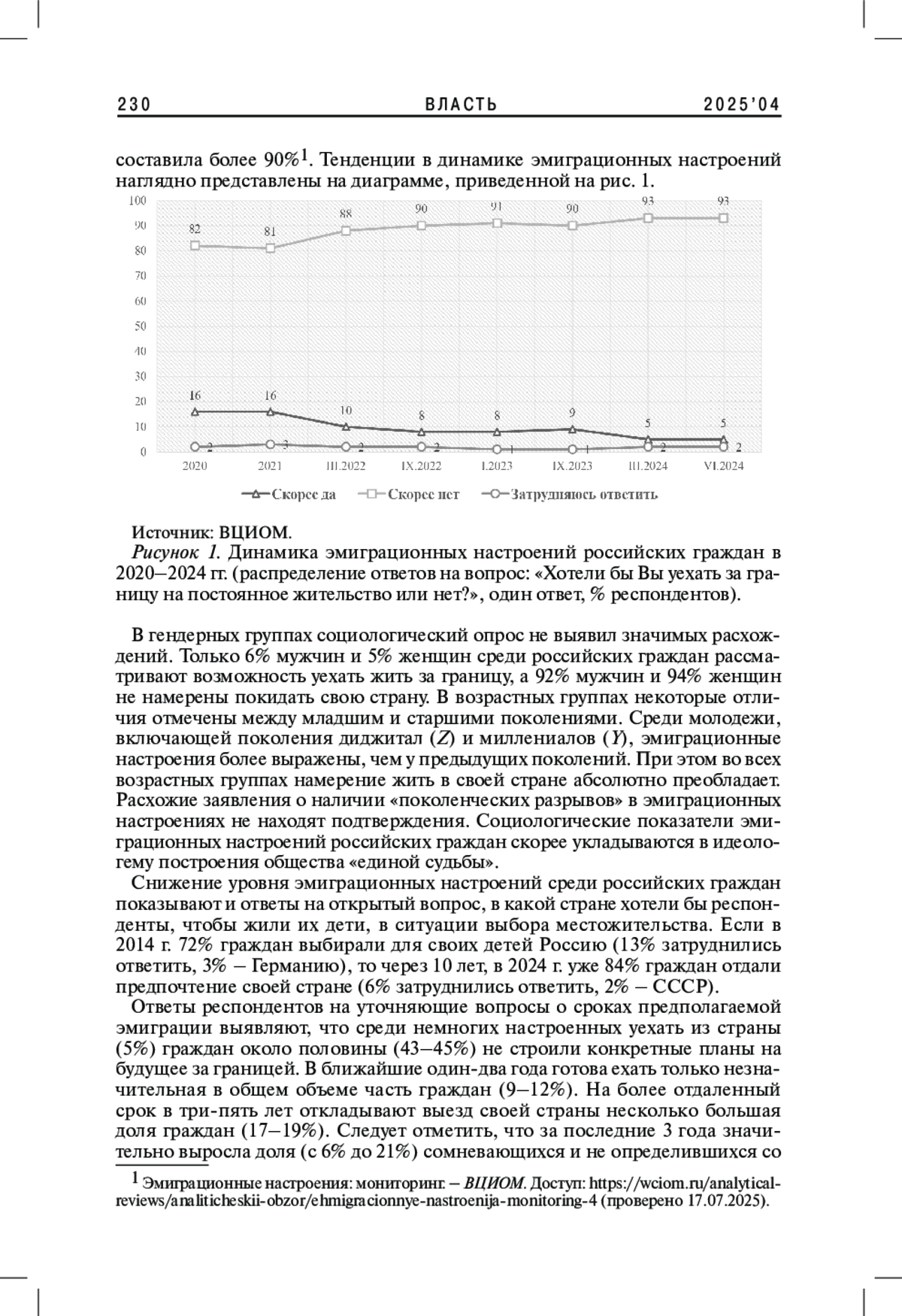 Статья посвящена исследованию динамики эмиграционных настроений среди российских граждан в период с 2020 по 2025 г. На основе анализа данных ВЦИОМа, Левада-Центра, Института Гэллапа авторы выявляют тенденции снижения эмиграционного потенциала на фоне значимых внешнеполитических и внутренних событий. Особое внимание уделяется влиянию факторов пандемии коронавируса, проведения специальной военной операции, внутренней мобилизации и повестки дня на общественные установки. Результаты показывают, что, вопреки классическим моделям push-pull миграции, эмиграционные намерения граждан России достигли исторического минимума. Объяснение видится в усилении патриотических настроений, консолидации общества и переоценке ценности гражданства в условиях мировой конфронтации.