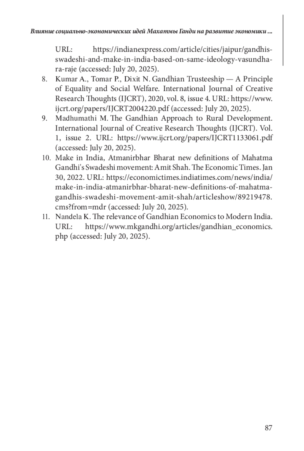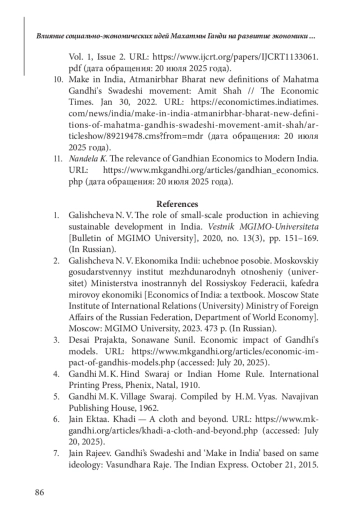 9. Madhumathi M. The Gandhian Approach to Rural Development // International Journal of Creative Research Thoughts (IJCRT) Vol. 1, Issue 2. URL: https://www.ijcrt.org/papers/IJCRT1133061.pdf (дата обращения: 20 июля 2025 года).