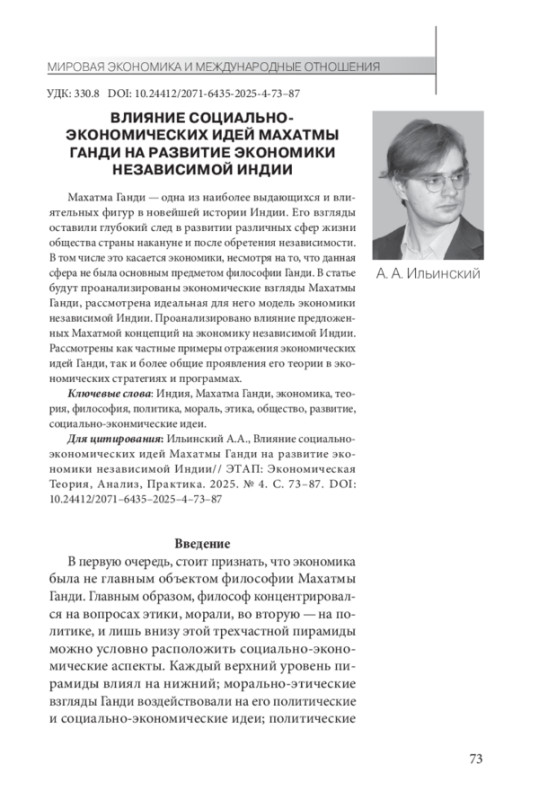 Махатма Ганди — одна из наиболее выдающихся и влиятельных фигур в новейшей истории Индии. Его взгляды оставили глубокий след в развитии различных сфер жизни общества страны накануне и после обретения независимости. В том числе это касается экономики, несмотря на то, что данная сфера не была основным предметом философии Ганди. В статье будут проанализированы экономические взгляды Махатмы Ганди, рассмотрена идеальная для него модель экономики независимой Индии. Проанализировано влияние предложенных Махатмой концепций на экономику независимой Индии. Рассмотрены как частные примеры отражения экономических идей Ганди, так и более общие проявления его теории в экономических стратегиях и программах.