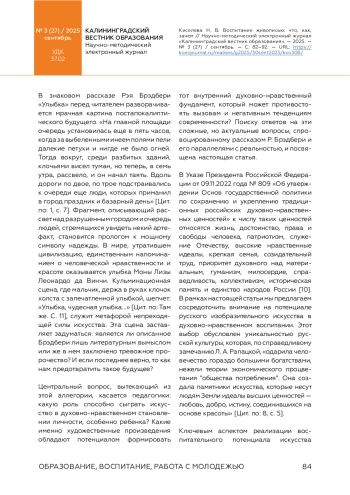 В статье рассматривается роль русского изобразительного искусства в духовно-нравственном воспитании школьников в контексте современных вызовов и задач, определенных государственной политикой в области сохранения традиционных ценностей. Автор анализирует потенциал живописи как инструмента формирования духовно-нравственного фундамента личности, способного противостоять негативным тенденциям современности. Предлагается интеграция произведений русского искусства в различные школьные дисциплины (например, в историю, обществознание, основы духовно-нравственной культуры народов России), смещая акцент с формального анализа к личностному восприятию и рефлексии. На примере конкретных картин русских художников (П. А. Федотова и современных художников О. Д. Савостьяновой, Ф. Иванова) для разных возрастных групп (начального общего, основного общего и среднего общего образования) демонстрируются методические подходы к использованию живописи для обсуждения нравственных понятий, исторической памяти и культурной идентичности. Особое внимание уделяется роли педагога как медиатора, осмысливающего и транслирующего ценностное содержание произведений искусства. Подчеркивается, что личная вовлеченность и искренность восприятия учителя является ключевым фактором эффективности воспитательного воздействия искусства. Обосновывается важность обращения к отечественной культуре как источнику национально-культурной идентичности и духовных идеалов.