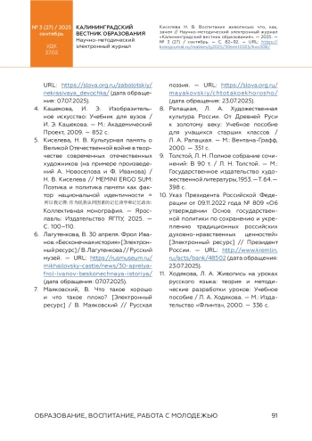 5. Киселева, Н. В. Культурная память о Великой Отечественной войне в творчестве современных отечественных художников (на примере произведений А. Новоселова и Ф. Иванова) / Н. В. Киселева // MEMINI ERGO SUM: Поэтика и политика памяти как фактор национальной идентичности = 所以我记得: 作为民族认同因素的记忆诗学和记忆政治: Коллективная монография. - Ярославль: Издательство ЯГПУ, 2025. - С. 100-110.