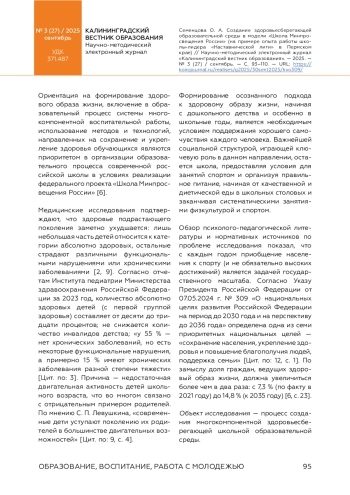 Ориентация на формирование здорового образа жизни, включение в образовательный процесс системы многокомпонентной воспитательной работы, использование методов и технологий, направленных на сохранение и укрепление здоровья обучающихся являются приоритетом в организации образовательного процесса современной российской школы в условиях реализации федерального проекта «Школа Минпросвещения России» [6].