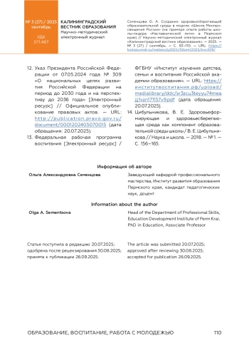 14. Цибульникова, В. Е. Здоровьеформирующая и здоровьесберегающая среда как компонент образовательной среды школы / В. Е. Цибульникова // Наука и школа. - 2018. - № 1. - С. 156-165.