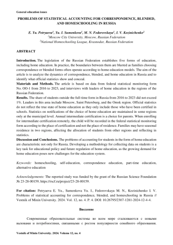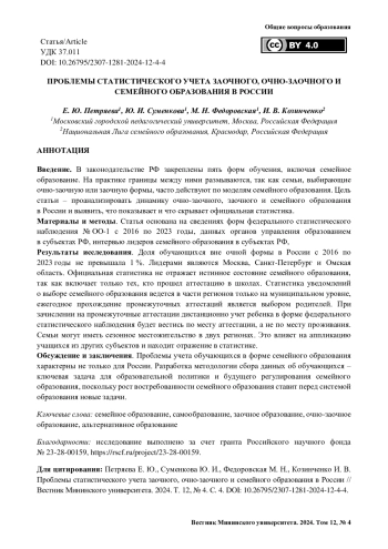 ПЕТРЯЕВА Е. Ю., СУМЕНКОВА Ю. И., ФЕДОРОВСКАЯ М. Н., КОЗИНЧЕНКО И. В. ПРОБЛЕМЫ СТАТИСТИЧЕСКОГО УЧЕТА ЗАОЧНОГО, ОЧНО-ЗАОЧНОГО И СЕМЕЙНОГО ОБРАЗОВАНИЯ В РОССИИ // ВЕСТНИК МИНИНСКОГО УНИВЕРСИТЕТА. 2024. ТОМ 12, № 4
