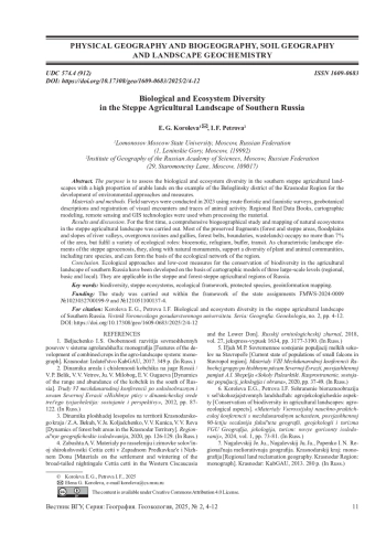 6. Королева Е. Г., Петрова И. Ф. Сохранение биоразнообразия в сельскохозяйственных ландшафтах: агроэкологические аспекты // “Материалы Всероссийской научно-практической конференции с международным участием, посвященной 90-летию создания факультета географии, геоэкологии и туризма ВГУ География, экология, туризм: новые горизонты исследований”, 2024, т. 1, с. 73-81. EDN: MRTADK