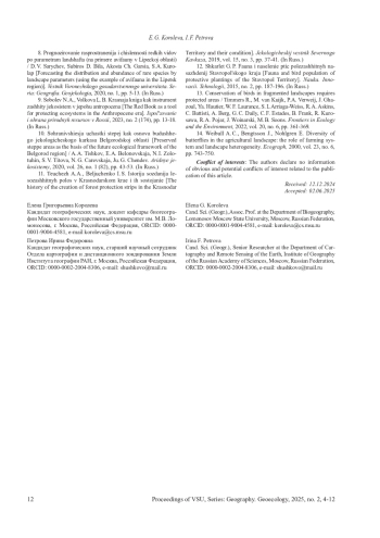 10. Сохранившиеся участки степей как основа будущего экологического каркаса Белгородской области / А. А. Тишков, Е. А. Белоновская, Н. И. Золотухин, С. В. Титова, Н. Г. Царевская, Ю. Г. Чендев // Аридные экосистемы, 2020, т. 26, № 1 (82), с. 43-53. EDN: CXBIPQ