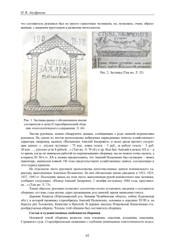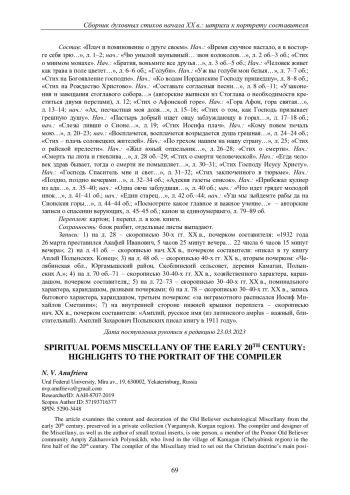 Представлен анализ содержания и художественного оформления старообрядческого сборника эсхатологического характера начала XX в. из частного собрания (г. Юргамыш, Курганская обл.). Составителем и оформителем сборника, а также автором небольших текстовых вставок является один человек - старообрядец поморской общины, проживавший в деревне Камаган (Челябинская обл.) в I половине XX в. Амплий Захарович Полынских. Составитель сборника попытался изложить основные позиции христианского учения о Страшном суде, показать путь к спасению верующих. Для этой цели он тематически подобрал духовные стихи, изложил собственное понимание истинности веры, сопроводив тексты выразительными графическими дополнениями в виде заставок, концовок, инициалов, двуцветных авторских миниатюр, а также комплексом красочных миниатюр, взятых, вероятно, из других сборников. Талантливо оформленный и грамотно составленный сборник представляет собой вариант соединения разъяснений положений «истинной веры», нравоучительных текстов с показом нравственного выбора человека и его ответственности за все совершаемое в жизни. Кроме того, сборник представляет собой исторический источник, в котором, благодаря авторским записям, пометам, отражена биография конкретного человека, старообрядца со своим интересным взглядом на жизнь, веру, тему спасения и проч. Многочисленные записи хозяйственного и поминального характера дают возможность увидеть частную судьбу человека определенного рода занятий, с творческим потенциалом и художественными устремлениями. Ценность сборника состоит в том, что это и талантливо выстроенный текст с живописными элементами декоративного оформления, и выразительный исторический источник, благодаря которому вырисовывается картина быта, занятий, духовных устремлений старообрядческого населения уральского региона I половины XX в.