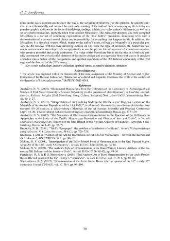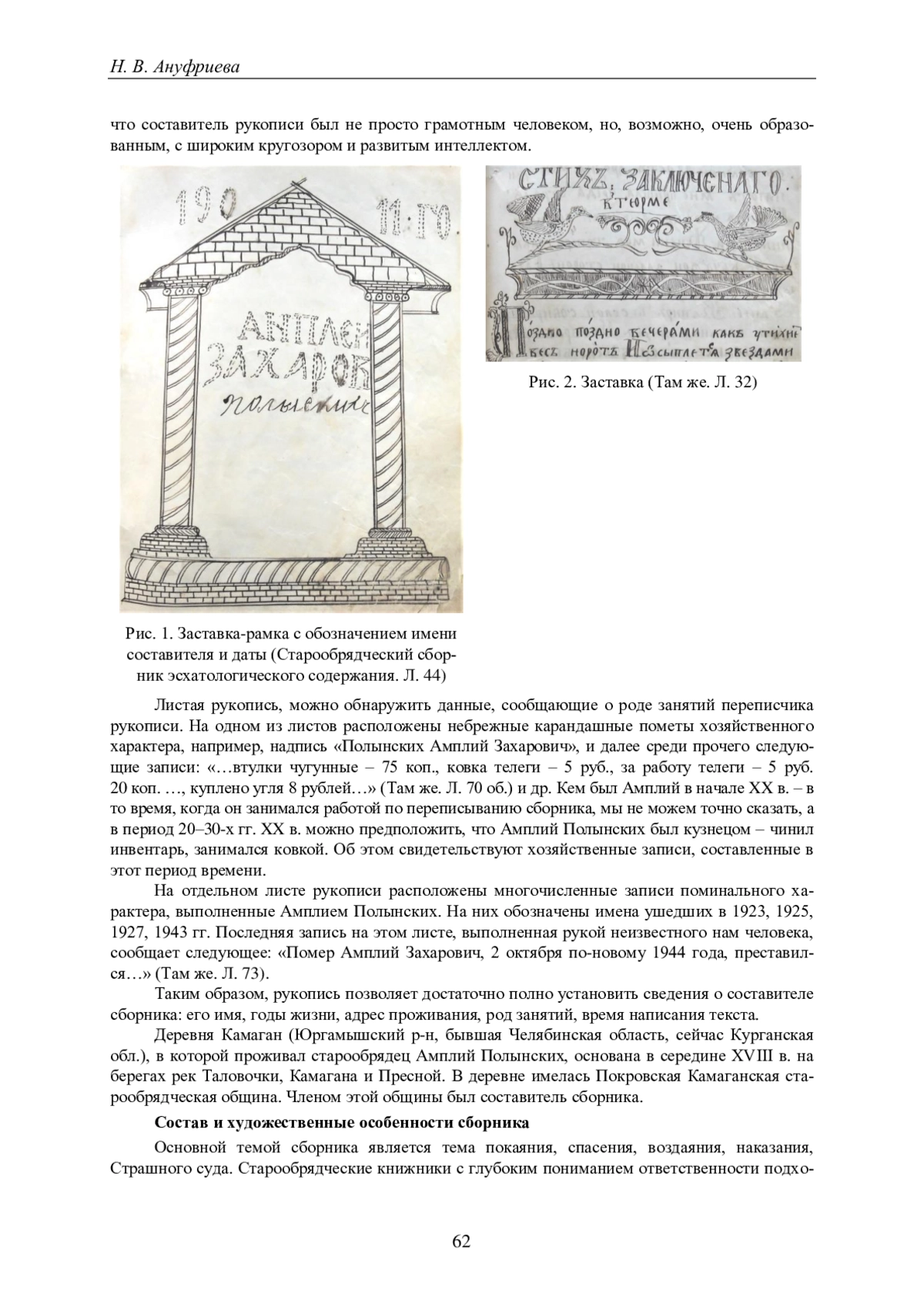 1. Ануфриева Н.В. Иллюминированные рукописи собрания Древлехранилища ЛАИ УрГУ (к вопросу о классификации) // Уральский сборник. История. Культура. Религия. Екатеринбург: Изд-во Урал. гос. ун-та, 2005. Вып. 6. С. 3-27.