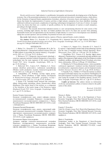 1. Балина Т.А., Конышев Е. В., Поспишенко М.А. Роль легкой промышленности в обеспечении индустрии туризма // География и туризм, 2023, № 2 (12), с. 19-25. EDN: MVAKGE