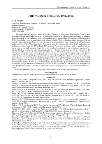 3. Антипин Н.А., Шестаков А.М. Инфраструктура челябинских старообрядцев (1905-1930 гг.) // Вестник Южно-Урал. гос. ун-та. Социально-гуманитарные науки. 2021. Т. 21, № 3. С. 32-39.