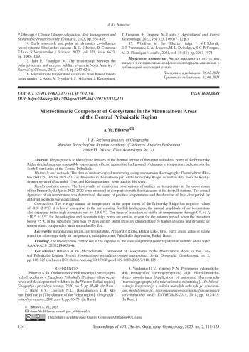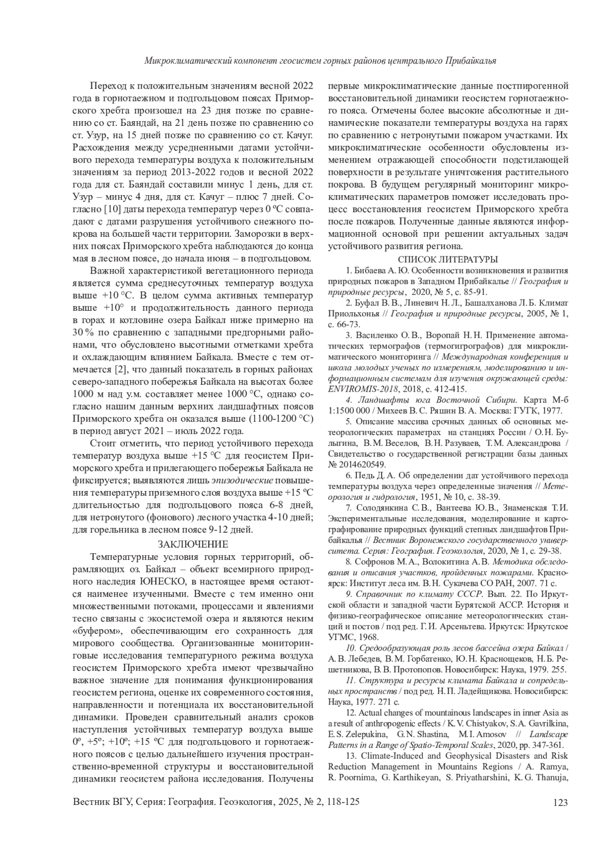 1. Бибаева А. Ю. Особенности возникновения и развития природных пожаров в Западном Прибайкалье // География и природные ресурсы, 2020, № 5, с. 85-91. EDN: TJXYWC