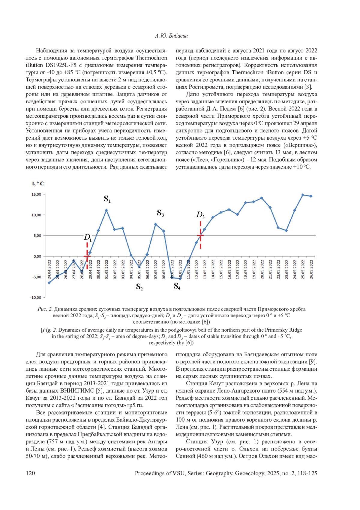 Целью исследования является выявление особенностей температурного режима верхних высотных поясов Приморского хребта (в т. ч. территорий, подверженных пирогенному воздействию) на фоне изменения температурных показателей предгорных территорий центрального Прибайкалья. Материалы и методы. В работе использованы данные метеорологического мониторинга с использованием автономных термографов Thermochron iButton DS1925L-F5 за 2021-2022 годы на трех площадках в северной части Приморского хребта, а также сведения сети Росгидромета (ст. Баяндай, Узур, Качуг). Результаты и обсуждение. Получены первые результаты мониторинговых наблюдений за температурой приземного слоя воздуха в верхних поясах Приморского хребта в 2021-2022 годах в сравнении с показателями на предгорных станциях. Определена годовая динамика температуры воздуха, рассчитаны суммы положительных температур и длительность безморозного периода для разных местоположений. Выводы. Среднегодовая температура воздуха в верхних поясах Приморского хребта имеет отрицательные значения -0,8-2,3 °С; она ниже по сравнению с окружающими предгорными ландшафтами; годовая амплитуда температуры воздуха также снижается в высокогорной части на 2,5-9 °С. Сроки перехода устойчивых температур воздуха через 0 °, +5 °; +10 °; +15 °С для подгольцового и горнотаежного поясов сходны, за исключением осеннего периода, когда переход ниже +5 °С в подгольцовом поясе осуществлялся на 19 дней раньше. Г ари характеризуются более высокими абсолютными и динамическими показателями температуры воздуха по сравнению с нетронутыми пожаром участками.