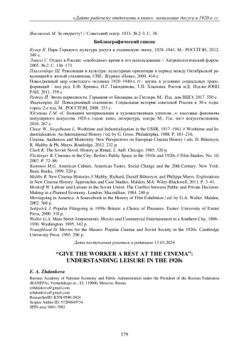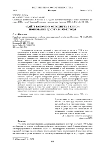 ЖДАНКОВА Е. А. "ДАЙТЕ РАБОЧЕМУ ОТДОХНУТЬ В КИНО": ПОНИМАНИЕ ДОСУГА В 1920-Е ГОДЫ // ВЕСТНИК ПЕРМСКОГО УНИВЕРСИТЕТА. ИСТОРИЯ. 2024. № 2 (65)