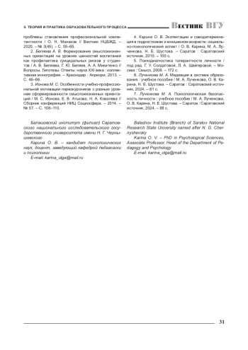 7. Лученкова М. А. Психологическая безопасность личности: учебное пособие / М. А. Лученкова, О. В. Карина, Н. Е. Шустова. - Саратов: Саратовский источник, 2024. - 88 с. EDN: QGKUAH