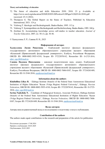 68. Seredkina A. S., Fedotova E. L., Nikitina E. A., Kazorina A. V., Shirina, A. A. Formation of the future teacher’s readiness to work with gifted children // SHS Web of Conferences. 2021. No. 101. Рр. 1-9. https://doi.org/10.1051/shsconf/202110103008.