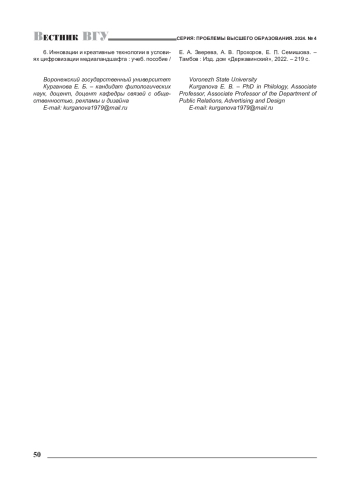 6. Инновации и креативные технологии в условиях цифровизации медиаландшафта: учеб. пособие /Е. А. Зверева, А. В. Прохоров, Е. П. Семишова. -Тамбов: Изд. дом “Державинский”, 2022. -219 с. EDN: DEVHUB