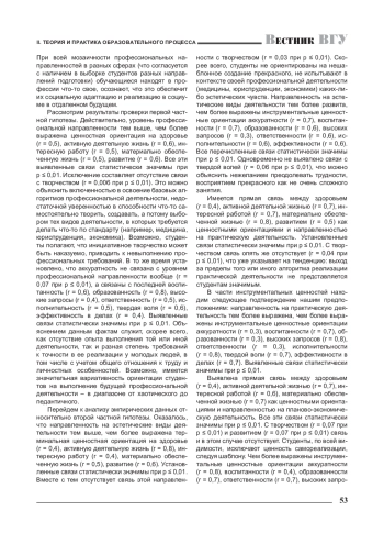 В статье рассматривается взаимосвязь ценностных ориентаций и профессиональной направленности у студентов как в целом, так и по разным сферам деятельности. В результате установлено, что терминальное ценностное наполнение имеет общие тенденции относительно связи с направленностью на эстетические и практические виды деятельности и отличается в остальных случаях, наиболее сильно при ориентации на работу с людьми и исследования. Проявляется более выраженное своеобразие ценностей-целей при направленности на работу с людьми, ценностей-средств при практической направленности, а всей системы ценностных ориентаций - при направленности на исследовательскую деятельность.
