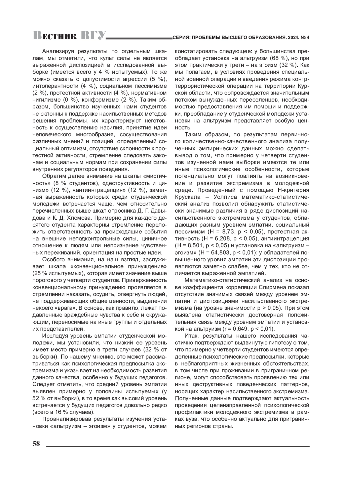 5. Евстифеева Е. А. Превенция насильственного экстремизма в контексте депривации психологического здоровья студенческой молодежи / Е. А. Евстифеева, С. И. Филиппченкова, А. В. Макаров // Вестник Воронежского государственного университета. Сер.: Проблемы высшего образования. - 2024. - № 2. - С. 40-45. EDN: GGQRGC