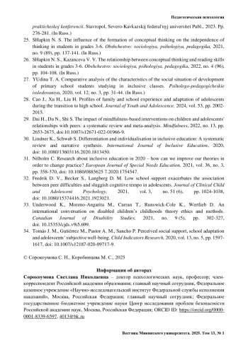 27. Юдина Т. А. Сравнительный анализ характеристик социальной ситуации развития младших школьников, обучающихся в инклюзивных классах // Психолого-педагогические исследования. 2020. Т. 12, № 3. С. 31-44.