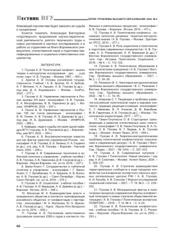 Как ученый А. В. Глухова вносит заметный вклад в развитие современной российской политологии, совместно с коллегами размышляя над общими тенденциями этой науки в актуальных социально-политических условиях [16; 17 и др.]. Наряду с этим скрупулезному исследованию подвергает отдельные темы и проблемы политической науки: политические конфликты, современный популизм, взаимодействие территориальных сообществ, миграционные процессы и др. [18–21 и др.]. Их анализ сегодня наиболее востребован, во-первых, для лучшего понимания происходящих в стране и мире политических процессов, во-вторых, для практики совершенствования государственно-политической системы России, в-третьих, для обогащения актуальным содержанием подготовки в университетах современных политологов, социологов, журналистов.