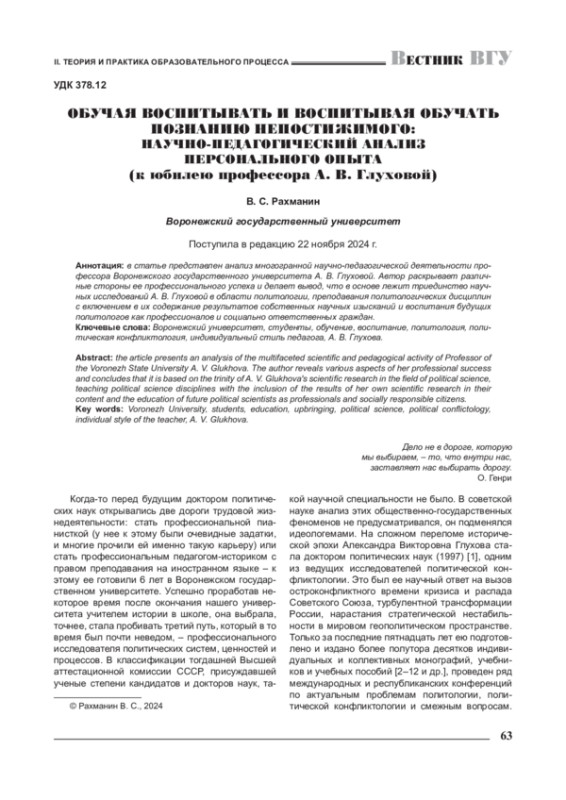 В статье представлен анализ многогранной научно-педагогической деятельности профессора Воронежского государственного университета А. В. Гпуховой. Автор раскрывает различные стороны ее профессионального успеха и делает вывод, что в основе лежит триединство научных исследований А. В. Глуховой в области политологии, преподавания политологических дисциплин с включением в их содержание результатов собственных научных изысканий и воспитания будущих политологов как профессионалов и социально ответственных граждан.