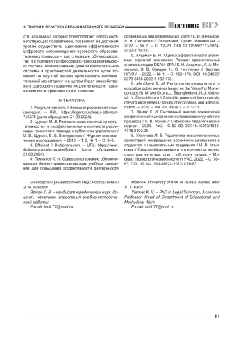 7. Ярмак К. В. Системный анализ показателей эффективности цифрового сопровождения учебного процесса / К. В. Ярмак // Сибирский педагогический журнал. -2024. - № 2. - С. 52-63. DOM0.15293/1813-4718.2402.05. EDN: BPIAPG