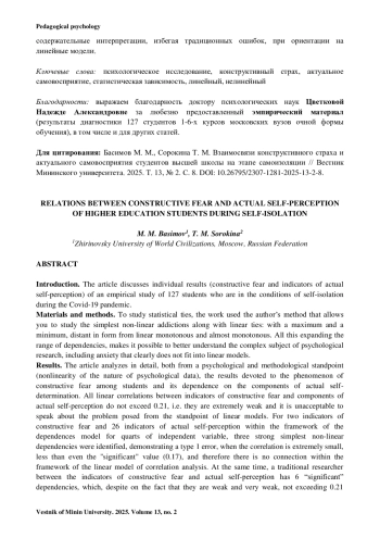 Результаты исследования. В статье подробно проанализированы как с психологической, так и с методологической позиции (нелинейность природы психологических данных) результаты, посвященные феномену конструктивного страха у студентов и его зависимости от компонент актуального самовосприятия. Все линейные корреляции между показателями конструктивного страха и компонентами актуального самовосприятия не превосходят 0.21, т. е. они крайне слабые, и говорить о поставленной проблеме с позиции линейных моделей неприемлемо. Для двух показателей конструктивного страха и 26 показателей актуального самовосприятия в рамках модели зависимостей для кварт независимых переменных было выявлено три сильных простейших нелинейных зависимости, демонстрирующих ошибку 1 типа, когда корреляция крайне мала, меньше по модулю даже «значимого» значения (0.17), а потому связи нет в рамках линейной модели корреляционного анализа. При этом традиционного исследователя между показателями конструктивного страха и актуального самовосприятия, скорее всего, заинтересуют 6 «значимых» зависимостей, которые, несмотря на то, что они слабые и очень слабые, не превышающие 0.21 (0.17<|r|<0.21), он может рассматривать как достойный для интерпретации результат, что недопустимо с позиции объективного изучения феномена конструктивного страха, так как такие зависимости справедливы не более, чем для 15-20 % представителей изучаемой выборки.