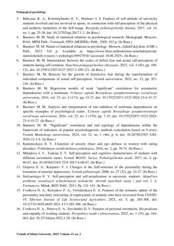 6. Басимов М. М. Взаимосвязи шкал дефицитарного страха и актуального самовосприятия студентов во время самоизоляции // Научно-педагогическое обозрение. 2023. Вып. 3 (49). С. 109-121. https://doi.org/10.23951/2307-6127-2023-3-109-121.