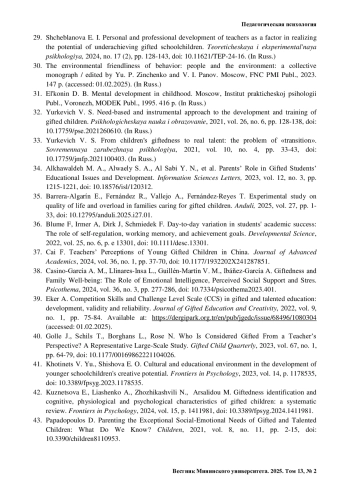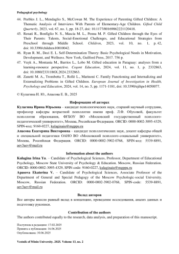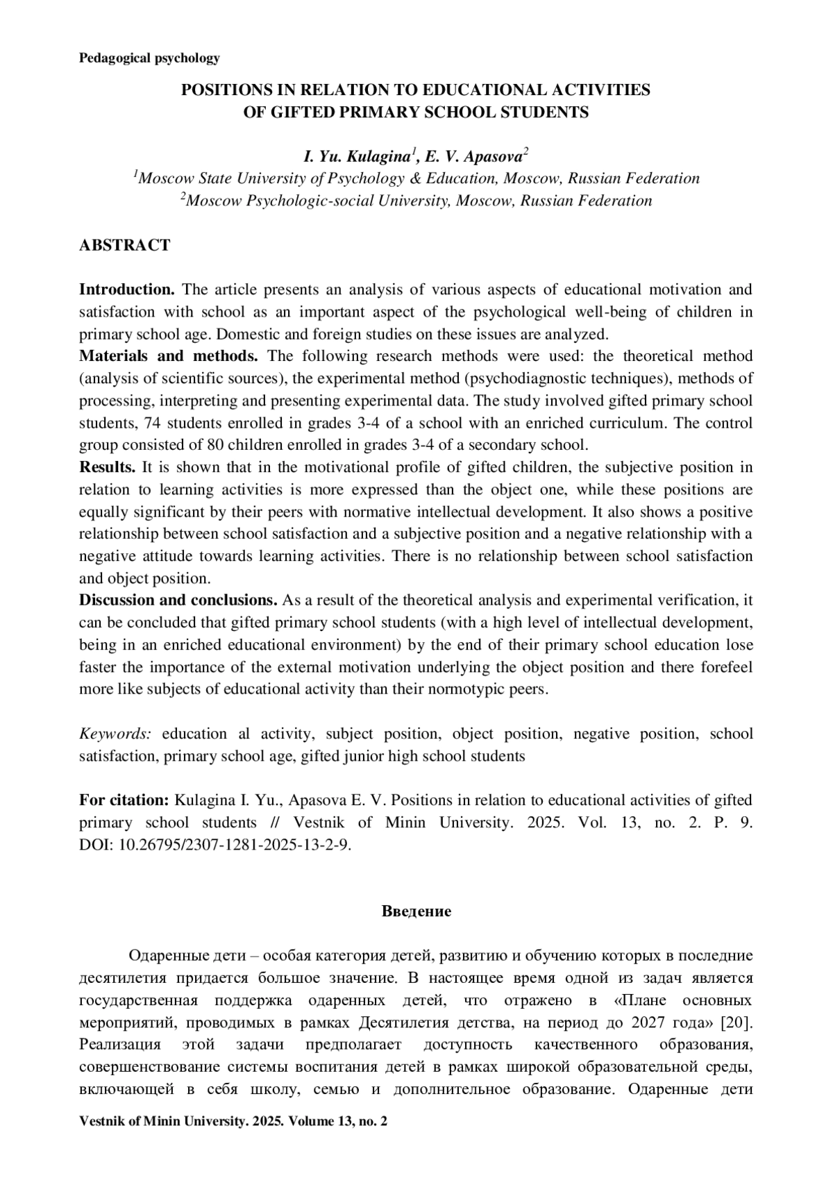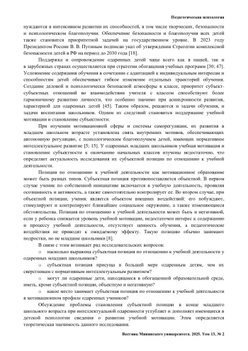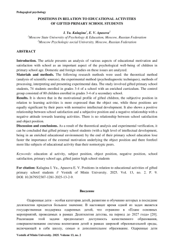 КУЛАГИНА И. Ю., АПАСОВА Е. В. ПОЗИЦИЯ ПО ОТНОШЕНИЮ К УЧЕБНОЙ ДЕЯТЕЛЬНОСТИ ОДАРЕННЫХ МЛАДШИХ ШКОЛЬНИКОВ // ВЕСТНИК МИНИНСКОГО УНИВЕРСИТЕТА. 2025. ТОМ 13, № 2