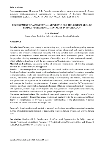 Введение. В настоящее время в нашей стране реализуется множество программ, направленных на поддержку женской занятости и профессионального развития через разнообразные образовательные и творческие инициативы. Исследование женской профессиональной ментальности поможет разработать более обоснованные с психологической точки зрения предложения для программ поддержки самореализации женщин в профессиональной сфере. Цель статьи – разработать понятийный аппарат предметной области женской профессиональной ментальности, которая позволит описать ее с необходимой и достаточной степенью полноты.