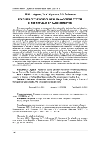 Охарактеризована система управленческой практики организации и обеспечения обучающихся общеобразовательных учреждений Республики Башкортостан школьным питанием. Актуальность заявленной темы обоснована с акцентом на социально-гуманистическую роль школьного питания для развития человеческого капитала. В связи с этим предлагается выделить социальные практики питания, куда относится и школьное, в особый вид экономической деятельности, в основе которого, с одной стороны, лежит невысокий коммерческий интерес основных игроков, а с другой - серьезные возможности для развития региональных экономик при поддержке государства. Выявлено, что основу системы управления школьным питанием составляют три важных процесса: планирование, реализация и контроль. Заключительным этапом управленческого процесса является корректировка. На этапе планирования, в соответствии с требованиями законодательства, органы исполнительной власти в лице министерств и ведомств осуществляют разработку и утверждение вариантов республиканских школьных меню, в том числе специализированных. К реализации плана приступают непосредственно образовательные организации. Этот этап условно делится на производство, за которое отвечают общеобразовательные организации и комбинаты питания, и потребление, участниками которого являются школьники и их родители. Реализация школьного питания тесно связана с системой контроля данного процесса. В Республике Башкортостан оценка организации и качества питания представлена в форме государственного и общественного контроля. Государственный контроль заключается в проверке санитарных условий и соответствия качества пищи установленным нормам. Общественный осуществляют Общественный совет при Министерстве образования и науки РБ, куда входят представители педагогического сообщества, специалисты в области развития образования, а также бракеражные комиссии, состоящие из родителей школьников. Анализ системы школьного питания на этапах планирования, реализации и контроля позволяет выявить необходимость корректировки на всех этих этапах для совершенствования механизма управления данным процессом.