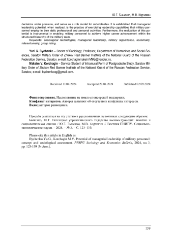 2. Быченко, Ю.Г. Способности к профессиональной адаптации в системе профессионального потенциала российских офицеров / Ю.Г. Быченко // Известия Юго-Западного государственного университета. Экономика. Социология. Менеджмент. - 2023. - Т. 13, № 1. - С. 215-226. EDN: QLVCSQ