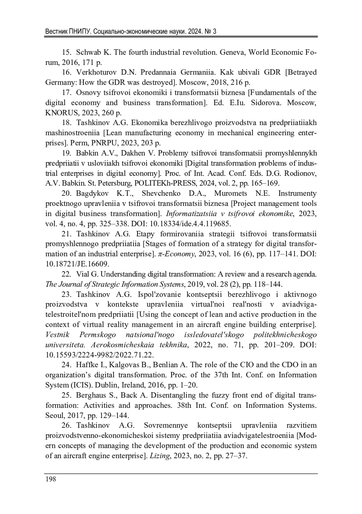 21. Ташкинов, А.Г. Этапы формирования стратегии цифровой трансформации промышленного предприятия / А.Г. Ташкинов // π-Economy. - 2023. - Vol. 16 (6). - P. 117-141. DOI: 10.18721/JE.16609 EDN: QWVGEO