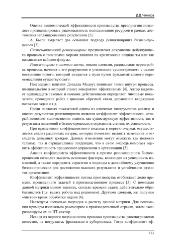 Представлено исследование применения коэффициентного подхода в оценке эффективности производственных процессов с особым акцентом на реинжиниринг бизнес-процессов. Описываются ключевые метрики оценки производственных процессов организации, включая коэффициент эффективности потока производства. Рассматривается фундаментальная разница между результативностью и эффективностью, а также между эффективностью и экономической эффективностью, что помогает понять суть рассматриваемых понятий. Проведен анализ различных подходов к реинжинирингу бизнес-процессов, выделяя два основных метода: систематический и радикальный. В контексте этого исследования особое внимание уделяется коэффициенту эффективности потока, который рассматривается как ключевой инструмент оценки производственной деятельности. Представлены различные подходы к расчету коэффициента эффективности потока производства, с акцентом на их применение в производственной и ИТ-отраслях. Обсуждаются преимущества и ограничения каждого из подходов, а также практическая значимость получаемых результатов для проведения оценочных работ касательно эффективности производственных процессов.