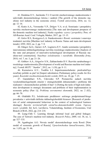 41. Демкина, О.В. О развитии отечественного станкостроения в условиях экономического кризиса и санкций / О.В. Демкина, Т.И. Юрченко // Вестник университета. - 2016. - № 12. - С. 12-16. EDN: XHNICL
