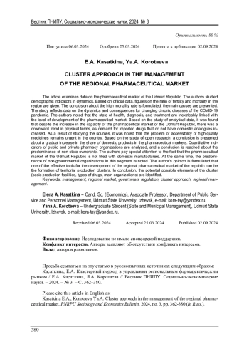 Исследованы данные о состоянии фармацевтического рынка Удмуртской Республики. Авторами изучены демографические показатели в динамике. На основании официальных данных приведены цифры о соотношении показателей рождаемости и смертности в регионе. Сформулирован вывод о высоком уровне смертности, представлены основные причины. В исследовании отражены данные о динамике и последствиях для изменения хронических заболеваний пандемии COVID-19. Авторами отмечено, что состояние здоровья, диагностика, лечение неразрывно связаны с уровнем развития фармацевтического рынка. На основе изучения аналитических данных установлено, что несмотря на увеличение емкости фармацевтического рынка Удмуртской Республики, в натуральном выражении появилась тенденция к снижению, так как вырос спрос на импортные препараты, не имеющие отечественных аналогов. В результате изучения источников отмечено, что в стране сохраняется актуальность проблемы доступности качественных лекарственных препаратов. На основе изучения открытых исследований представлен вывод о постепенном увеличении доли отечественной продукции на фармацевтических рынках. Проанализированы количественные показатели государственных и частных аптечных организаций, получен вывод о преобладании негосударственной формы собственности. Особенное внимание в работе авторы акцентируют на том факте, что фармацевтический рынок Удмуртской Республики не богат отечественными предприятиями - производителями лекарственных препаратов. При этом отмечается преобладание негосударственных организаций в данном сегменте. Сформулировано авторское мнение о том, что одним из действенных инструментов развития регионального фармацевтического рынка республики может стать формирование территориально-производственных кластеров. В заключение определены потенциально возможные элементы кластера (базовые производственные мощности, виды препаратов, основные организации).